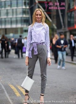 秋冬高级灰色百搭穿法 超模示范时尚优雅单品 紫色衬衫+格纹窄脚西裤+露趾高跟鞋+手包 用彩色来渐变的灰色的暗沉;紫色穿的人很温柔,窄脚西裤和高跟鞋也减少了中性的味道,只有时尚和干练的感觉。副标题 秋冬高级灰色百搭穿法 超模示范时尚优雅单品 灰