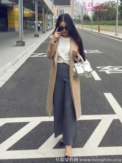 女胖人冬季显瘦穿衣搭配图片 告别臃肿尴尬效果 呢子大衣+t恤+阔腿裤+单鞋+手提包 阔腿裤可以遮挡腿部肉肉,是女胖人的必备单品,穿一条高腰阔腿裤搭配简约t恤衫,外披卡其色宽松呢子大衣,脚上一双优雅的尖头单鞋,带上个手提包,很显气质的冬季显瘦搭配。#p