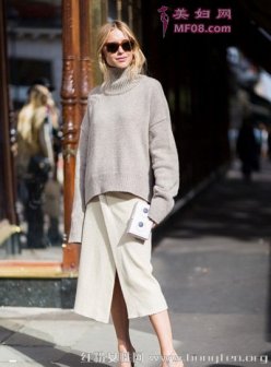 廓型毛衣设计保暖又有型 宽松毛衣遮肉藏身材 灰色的高领毛衣搭配浅杏色的开衩裙很优雅呢,这种宽+宽的穿法是小编最欣赏的,你也可以宽+紧,但宽+紧就很普通而已。 搭配技巧:灰色高领宽松毛衣+杏色开衩裙+裸色高跟鞋副标题 廓型毛衣设计保暖又有型 宽