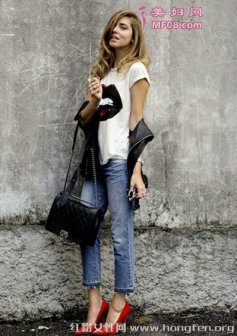基础白色T恤经典不过时 街拍达人示范简约服饰搭配 穿搭要点:白色T恤+皮衣+牛仔裤+红色高跟鞋+单肩包 小编点评:作为当今最红火的时尚博主,CHIARA FERRAGNI的搭配功力当然不容小觑。一件简单的白T恤,搭配牛仔裤都可以这么好看,当然,九分裤+高跟鞋的显高