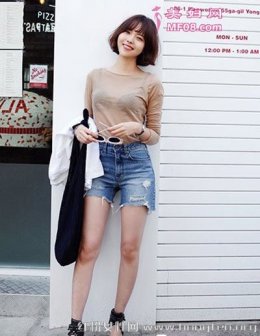 短裙热裤秋季也能穿 时髦显瘦秀美腿必备单品 裸色透视修身上衣搭配高腰牛仔短裤,很性感清爽的装扮,既能凸显时尚感,还能穿出成熟女人味,搭配凉鞋,大秀美腿,清凉时髦。副标题 短裙热裤秋季也能穿 时髦显瘦秀美腿必备单品 粉色露肩长袖上衣搭配白色