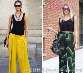 欧美达人示范阔腿裤穿搭技巧 高腰款式拉长身材比例显腿长 左边黑色背心被黄色阔腿裤,展现模特般的气场;右边黑色露脐上衣配印花阔腿裤,高腰的款式拉长比例,显得很修长。副标题 欧美达人示范阔腿裤穿搭技巧 高腰款式拉长身材比例显腿长 白色阔腿裤清