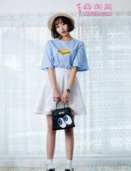基础款T恤配短裙or短裤 简约显瘦尽显青春活力 浅蓝色T恤版型宽松,袖子也很宽大,穿起来格外舒适有范,也显得很时尚,一抹黄色点缀很抢镜,搭配白色高腰短裙,清新浪漫的少女风格,尽显青春活力。副标题 基础款T恤配短裙or短裤 简约显瘦尽显青春活力