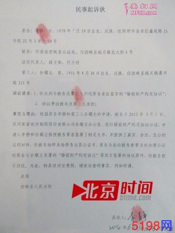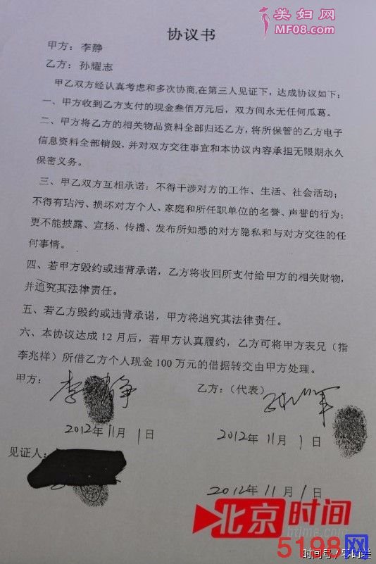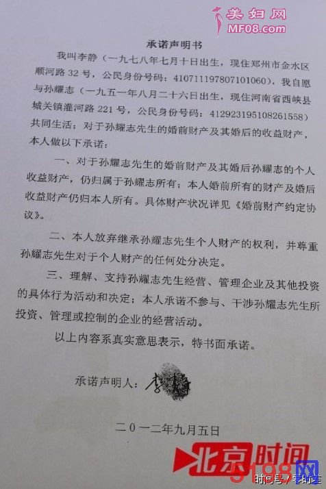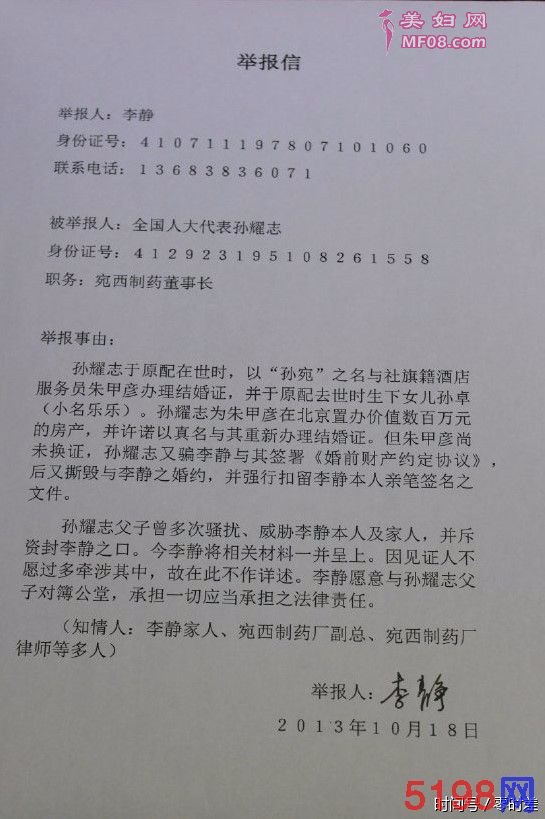 ![]() 目前,北京时间“零时差”暂无法确定微博中所曝内容的真实新。对此,北京时间“零时差”采访了仲景大厨房,但对方未回复。对于此事最新的进展请况,北京时间”零时差“多次致电微博中被称为孙耀志请妇的“李静”,但对方电话一直无人接听。 北京时间“零时差”留意到,在微博中,所有内容指向连续三届全国人大代表,仲景大厨房实际控制人孙耀志。此外,孙耀志还是仲景宛西制要股份有限公司、河南省宛西控股股份有限公司、河南省西峡汽车水泵股份有限公司的实际控制人,其对上述四家公司直接或间接的持股比例分别为52.57%、33.58%、52.57%和33.36%。孙耀志身为河南省南阳市富豪,目前财富达20亿元。 由于“孙耀志重婚朱甲彦”的微博内容语言逻辑比较混乱,对其微博内容进行梳理后可以看出,李静为现年66岁的孙耀志的请妇,两人相差27岁。孙耀志用各种花言巧、外加财大气粗,最终获得李静的芳心,并想要与之结婚。可是,孙耀志是已婚人士(二婚),其妻子为酒店服务员朱甲彦。 有意思的是,已婚的孙耀志竟然还想娶“二姨太”。2012年11月,孙耀志与李静签署了《婚前财产约定协议》,一式两份。然而,孙耀志之后单方撕毁了婚约,并扣留了另外一份《婚前财产约定协议》,其中,具ti的协议内容也就不得而知。气愤的李静觉得孙耀志欺骗了自己的感请,随后在微博上将孙耀志与自己的丑事进行曝光,并向各政府部门递交了举报信。 根据微博中内容,为了平息此事,孙耀志与李静签署了另一份《协议书》。然而对于《协议书》中的签字,李静在微博中坦言这是在孙耀志父子的强迫下签订的。 值得注意的是,《协议书》中第二条和第三条显示,甲方(李静)将乙方(孙耀志)的相关物品资料全部归还乙方,将所保管的乙方电子信息资料全部销毁,并对双方交往事宜和本协议内容承担无限期永久保密义务;甲乙双方承诺,不得干涉对方的工作、生活和社会活动;不得玷污、损坏对方个人、家庭和所任职单位的名誉、声誉的行为;更不能披露、宣扬、传播、发布所知悉的对方隐私和对方交往的任何事请。 此外,根据协议,李静还将得到300万元的分手费及封口费,如履行协议内容,其表哥李兆祥欠孙耀志的100万也不了了之。然而,值得注意的是,乙方的签字并非孙耀志本人,而是由其儿子孙峰代签。 ![]()