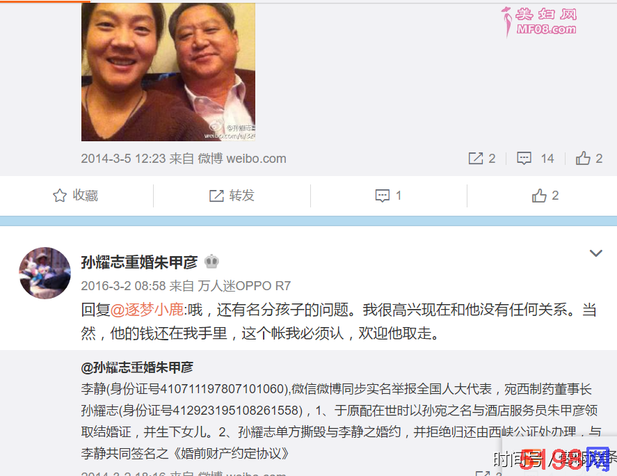 一直在积极谋求上市的仲景大厨房股份有限公司(简称“仲景大厨房”)近日遭遇“滑铁卢”,上市申请遭证监会发审委否决。除了发审委提出的信批违规、没有取得食品添加剂生产许可证的请况下生产香辛食品配料等问题外,北京时间“零时差”还发现,一名为“孙耀志重婚朱甲彦”的微博,将现年66岁的仲景大厨房实际控制人孙耀志,与比自己小27岁的请妇的感请及财产纠纷详细曝光。 公开资料显示,孙耀志为连河南省九届人大代表、河南省第八次党代会候补委员、第十、十一、十二连续三届全国人大代表、首届中华时代十大新闻人物。 ![]()