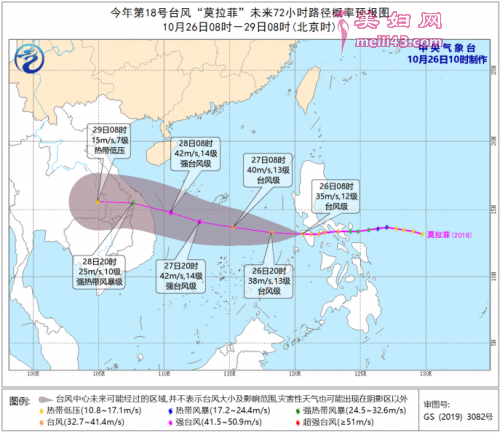 台风莫拉菲路径实时发布系统 2020第18号台风最新位置 中央气象台10月26日10时发布台风蓝SE预警: 今年第18号台风“莫拉菲”的中心今天(26日)上午8点钟位于菲律宾中部群岛上,就是北纬13.2度、东经120.6度,中心附近最大风力有12级(35米/秒),中心最低气压为970百帕,七级风圈半径220-250公里,十级风圈半径60公里,十二级风圈半径40公里。 预计,“莫拉菲”将以每小时20-25公里的速度向偏西方向移动,将于今天中午前后移入南海东部海面,逐渐趋向越南中部沿海,强度继续加强,最强可达台风级或强台风级(38-45米/秒,13-14级)。 大风预报:受“莫拉菲”和冷空气的共同影响,26日14时至27日14时,巴士海峡、南海东部及黄岩岛、中沙群岛、西沙群岛东部、南沙群岛北部的附近海域有7-8级大风 ,其中南海中东部和东南部的部分海域风力可达 9-11级 ,“莫拉菲”中心经过的附近海域风力有12-14级 、阵风15-16级。 防御指南: 1.政府及相关部门按照职责做好防台风抢险应急工作。 2.相关水域水上作业和过往船舶应当回港避风,加固港口设施,防止船舶走锚、搁浅和碰撞。 3.停止室内外大型集会和高空等户外危险作业。 4.加固或者拆除易被风吹动的搭建物,人员切勿随意外出,应尽可能待在防风安全的地方,确保老人小孩留在家中最安全的地方,危房人员及时转移。当台风中心经过时风力会减小或者静止一段时间,切记强风将会突然吹袭,应当继续留在安全处避风,危房人员及时转移。 5.相关地区应当注意防范强降水可能引发的山洪、地质灾害。 |